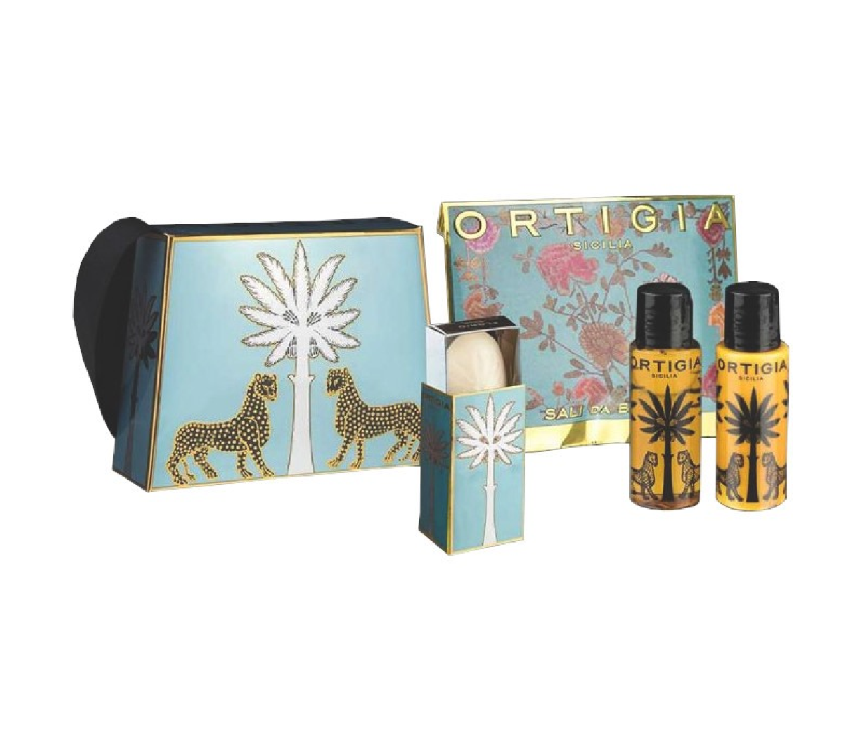 Borse dai colori vivaci con interno leopardato, contenenti i prodotti naturali profumati di Ortigia in miniatura, ideali come regalo o da viaggio. Lo stile italiano incontra la storia e la magia della Sicilia.